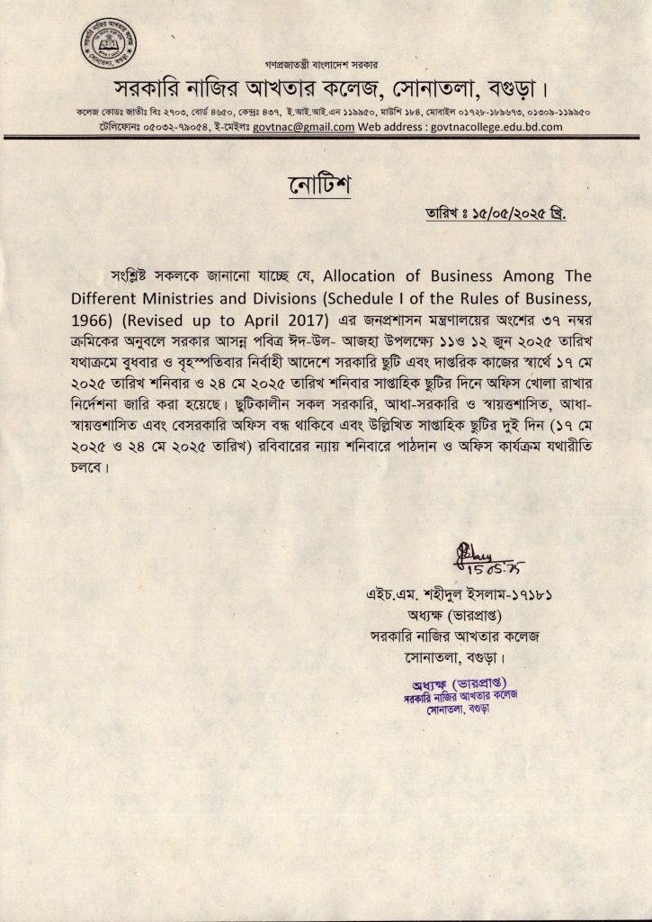 ১৭ মে ২০২৫ তরিখ শনিবার ও ২৪ মে ২০২৫ তারিখ শনিবার শ্রেণি কার্যক্রম ও অফিস খোলা রাখা প্রসঙ্গে