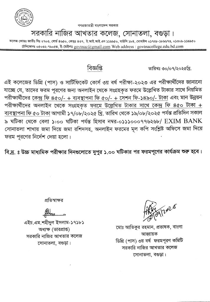 ডিগ্রি (পাস) ও সার্টিফিকেট কোর্স- ২০২৩ এর ফরমপূরণ সংক্রান্ত নোটিশ