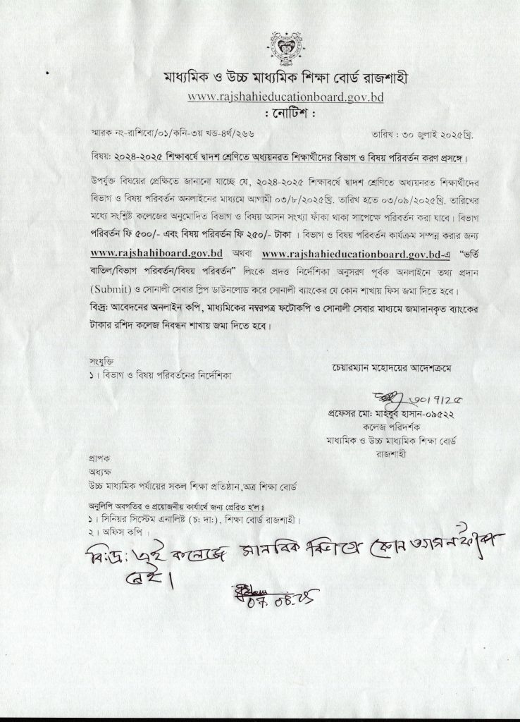 ২০২৪-২০২৫ শিক্ষাবর্ষের দ্বাদশ শ্রেণিতে অধ্যয়নরত শিক্ষার্থীদের বিভাগ ও বিষয় পরিবর্তন প্রসঙ্গে