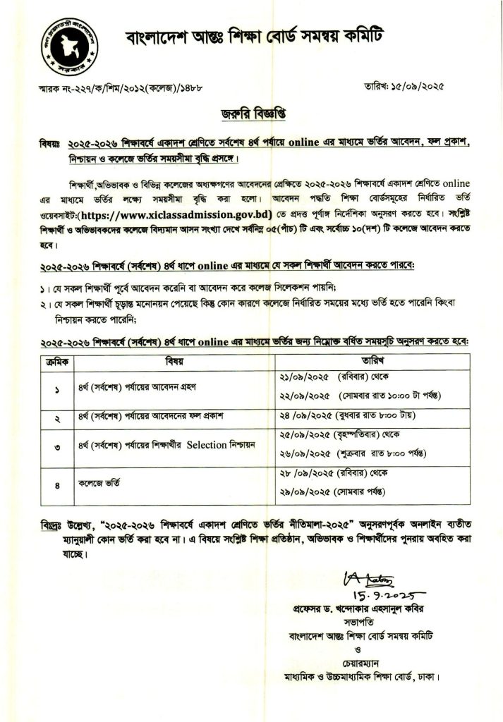 একাদশ শ্রেণির ভর্তির সময় বৃদ্ধি সংক্রান্ত