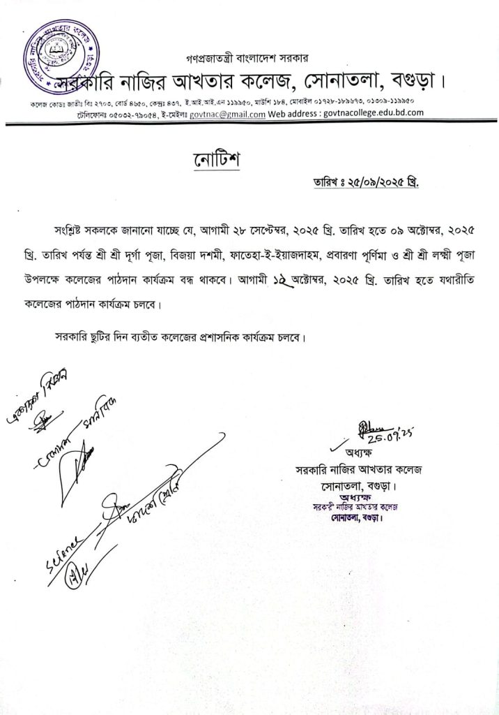 শ্রী শ্রী দূর্গা পূজা, বিজয়া দশমী, ফাতেহা-ই-ইয়াজদাহম, প্রবারণা পূর্ণিমা ও শ্রী শ্রী লক্ষ্মী পূজা উপলক্ষে কলেজের পাঠদান কার্যক্রম বন্ধ সংক্রান্ত নোটিশ